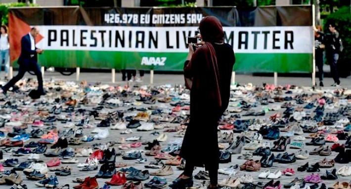 এবার বেলজিয়ামের রাজধানী ব্রাসেলসে ইউরোপিয় ইউনিয়নের সদর দপ্তরের সামনে ৪ হাজার ৫০০ জুতা রেখে এক ভিন্নধর্মী প্রতিবাদ শুরু করেছে আভাজ ক্যাম্পেইন নামক একটি বিশ্ব নাগরিক সংস্থা।