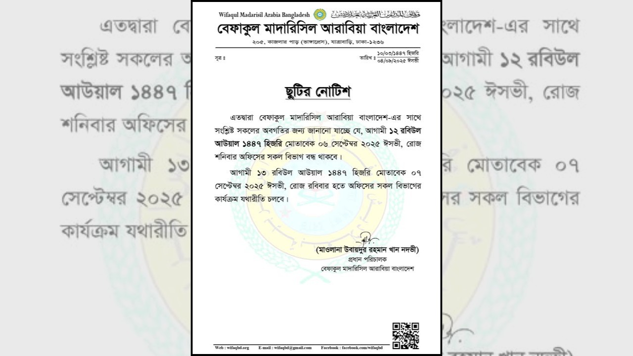 বাংলাদেশ কওমী মাদরাসা শিক্ষা বোর্ড (বেফাকুল মাদারিসিল আরাবিয়া) আগামী ১২ রবিউল আউয়াল (০৬ সেপ্টেম্বর ২০২৫, শনিবার) সকল কার্যক্রম বন্ধ রাখার ঘোষণা দিয়েছে। বৃহস্পতিবার (৪ সেপ্টেম্বর) বেফাকের প্রধান পরিচালক মাওলানা উবায়দুর রহমান খান নদভী স্বাক্ষরিত এক বিজ্ঞপ্তিতে এ তথ্য জানানো হয়। বিজ্ঞপ্তিতে বলা হয়, আগামী ১২ রবিউল আউয়াল ১৪৪৭ হিজরি মোতাবেক ০৬ সেপ্টেম্বর ২০২৫ খ্রিস্টাব্দ শনিবার অফিসের সকল বিভাগ বন্ধ থাকবে। পরদিন ১৩ রবিউল আউয়াল (০৭ সেপ্টেম্বর, রবিবার) থেকে যথারীতি অফিসের সকল বিভাগের কার্যক্রম চালু হবে। এসএকে/ |