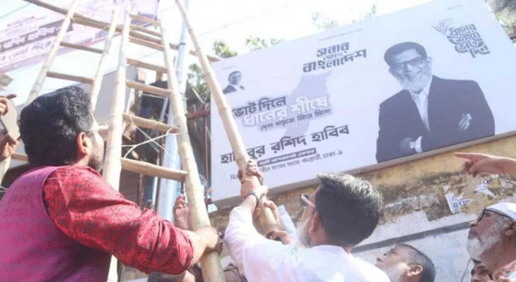 নিজ হাতে ব্যানার খুলছেন ঢাকা-৯ আসনের এমপি হাবিব