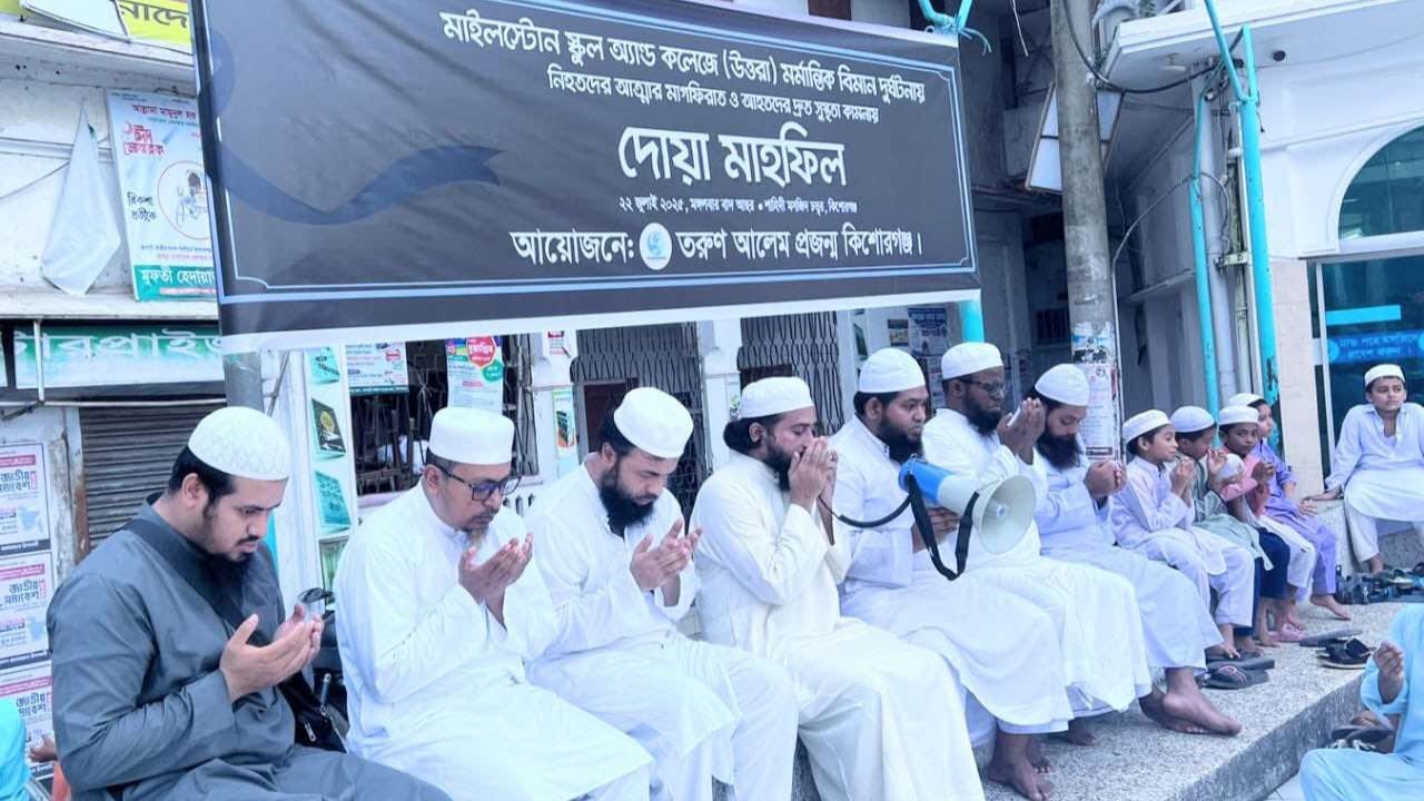 রাজধানী ঢাকার মাইলস্টোন স্কুল অ্যান্ড কলেজ এ মর্মান্তিক বিমান দুর্ঘটনায় নিহত শিক্ষার্থী ও সংশ্লিষ্টদের রুহের মাগফিরাত এবং আহতদের দ্রুত আরোগ্য কামনায় কিশোরগঞ্জে অনুষ্ঠিত হয়েছে বিশেষ দোয়া মাহফিল ও খতমুল কুরআন।