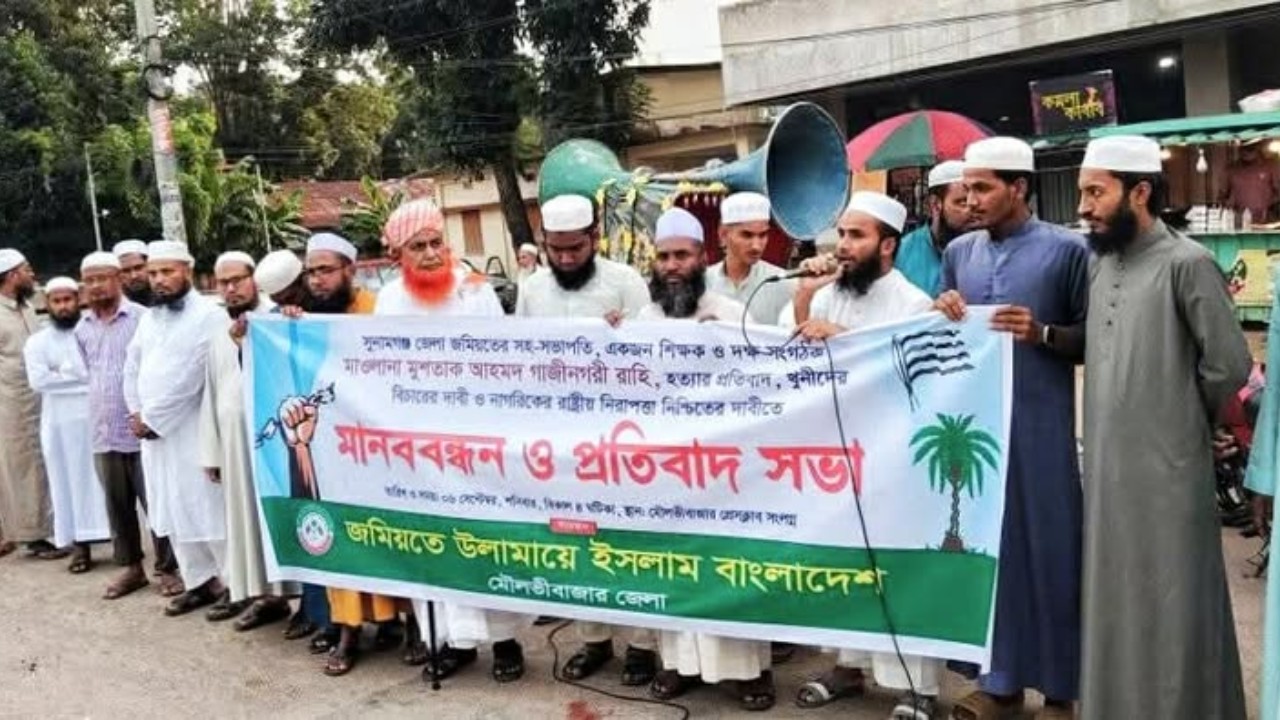 শনিবার (৬ সেপ্টেম্বর) বিকেল ৫টায় মৌলভীবাজার প্রেসক্লাব চত্বরে এ প্রতিবাদ সমাবেশ ও মানববন্ধন অনুষ্ঠিত হয়। এতে সভাপতিত্ব করেন জেলা জমিয়তের সভাপতি মাওলানা জামিল আহমদ আনসারী এবং সঞ্চালনা করেন জেলার প্রচার সম্পাদক মাওলানা মাহদী হাসান কামাল।