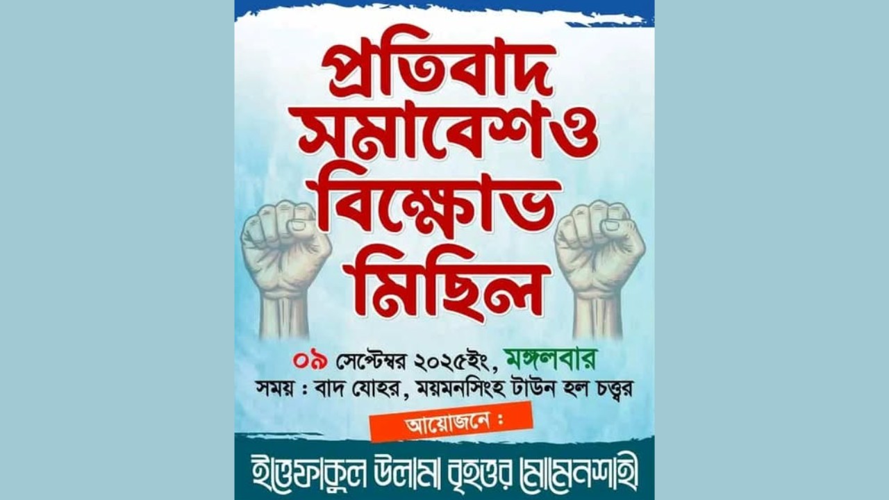 আগামীকাল মঙ্গলবার (৯ সেপ্টেম্বর) বাদ জোহর ময়মনসিংহের টাউন হল চত্বরে এই সমাবেশ অনুষ্ঠিত হবে।