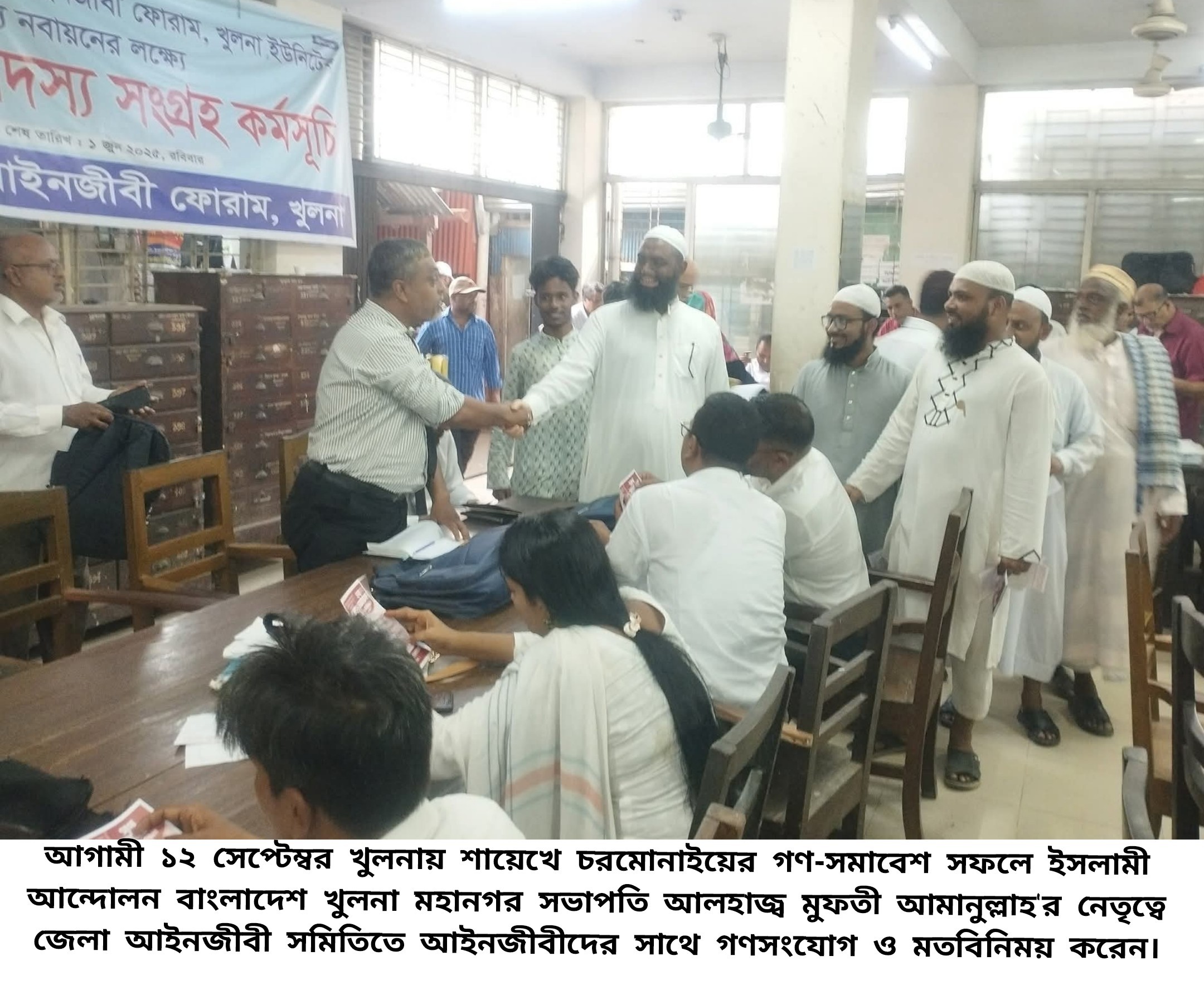 খুলনা, ৮ সেপ্টেম্বর: আগামী ১২ সেপ্টেম্বর খুলনায় শায়খে চরমোনাই (আমীর, ইসলামী আন্দোলন বাংলাদেশ) এর নেতৃত্বে অনুষ্ঠিতব্য গণ-সমাবেশ সফল করার লক্ষ্যে ইসলামী আন্দোলন বাংলাদেশ খুলনা মহানগরের উদ্যোগে নগরব্যাপী গণসংযোগ ও লিফলেট বিতরণ কর্মসূচি অনুষ্ঠিত হয়েছে।