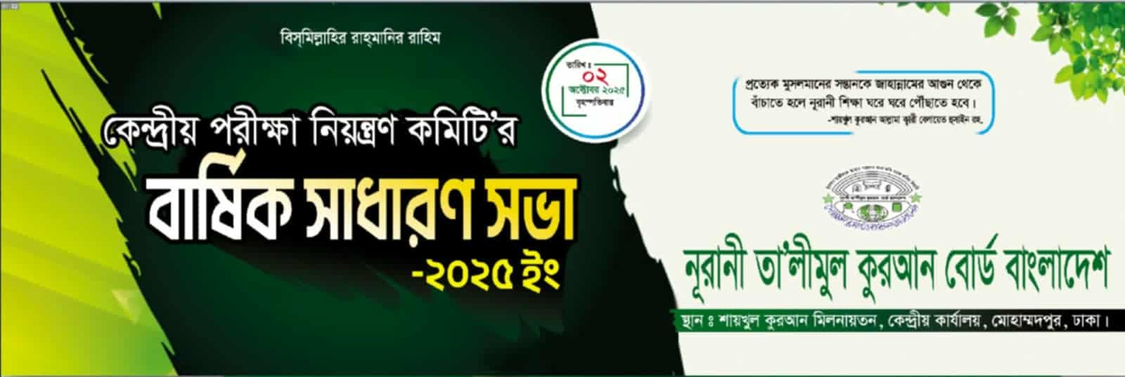 আল্লামা কারী বেলায়েত রহ. প্রতিষ্ঠিত নূরানী তা'লীমুল কুরআন বোর্ড বাংলাদেশের পরীক্ষা নিয়ন্ত্রণ কমিটির বার্ষিক সাধারণ সভা আগামীকাল বৃহস্পতিবার (২ অক্টোবর) অনুষ্ঠিত হবে।