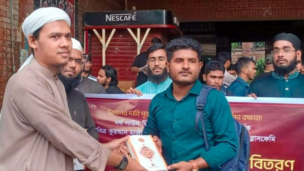 নর্থ সাউথ বিশ্ববিদ্যালয়ের এক শিক্ষার্থী অপূর্ব পাল কর্তৃক কোরআন মাজিদ অবমাননার প্রতিবাদে জাহাঙ্গীরনগর বিশ্ববিদ্যালয়ের একদল শিক্ষার্থী মঙ্গলবার (৭ অক্টোবর) অনুষদের সামনে কোরআন বিতরণ, তেলাওয়াত, নাশিদ ও বিক্ষোভ সমাবেশ পালন করেন।