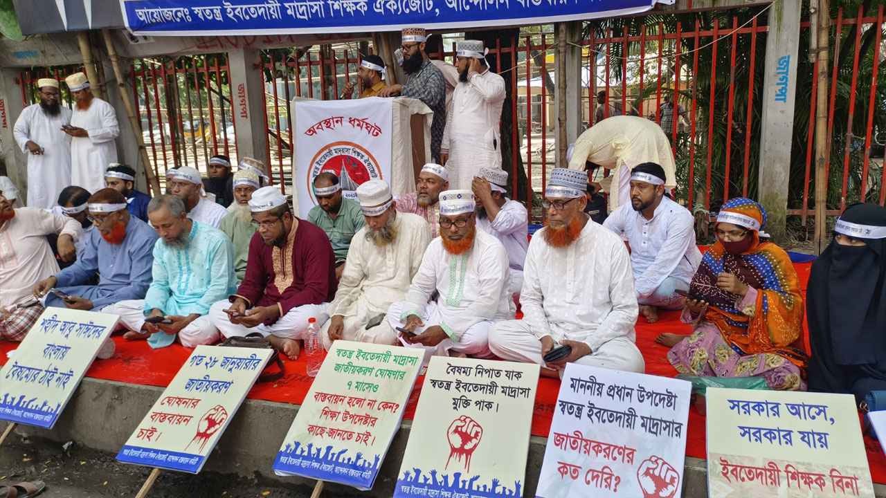 বাংলাদেশ মাদরাসা শিক্ষা বোর্ড কর্তৃক স্বীকৃতিপ্রাপ্ত অনুদানভুক্ত ও অনুদানবিহীন সব স্বতন্ত্র ইবতেদায়ি মাদরাসা জাতীয়করণের দাবিতে রাজধানীর জাতীয় প্রেসক্লাবের সামনে লাগাতার অবস্থান ধর্মঘট পালন করছেন শিক্ষকরা।