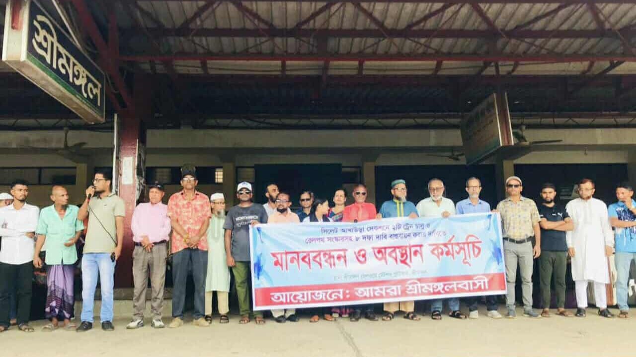 সিলেট-ঢাকা ও সিলেট-কক্সবাজার রেলপথে দুটি বিশেষ ট্রেন চালু, আখাউড়া-সিলেট রেলপথ সংস্কার করে ডাবল লাইনে উন্নীতকরণসহ ৮ দফা দাবিতে মৌলভীবাজারের শ্রীমঙ্গলে মানববন্ধন ও অবস্থান কর্মসূচি পালিত হয়েছে।