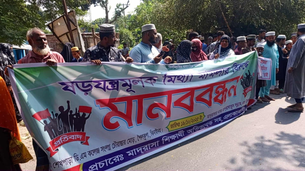 ঝিনাইদহের শৈলকুপার শেখপাড়া মাদরাসাতুস সুন্নাহ অ্যান্ড ইসলামিক স্কুলের দুই শিক্ষকের মুক্তির দাবিতে মানববন্ধন করেছে এলাকাবাসী।