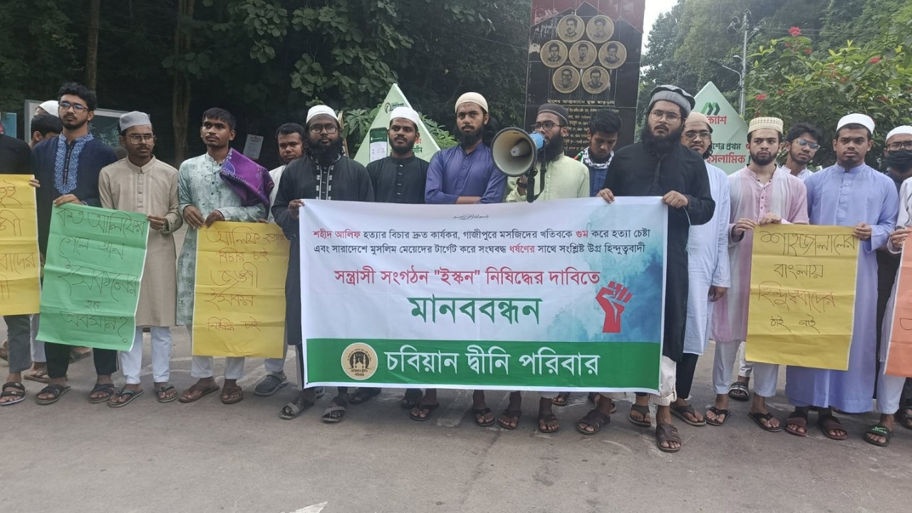 শহীদ আলিফ হত্যার বিচার দ্রুত কার্যকর, গাজীপুরে মসজিদের খতিবকে গুম করে হত্যা চেষ্টা এবং সারাদেশে মুসলিম মেয়েদের টার্গেট করে সংঘবদ্ধ ধর্ষণের সাথে সংশ্লিষ্ট উগ্র হিন্দুত্ববাদী সন্ত্রাসী সংগঠন "ইসকন" নিষিদ্ধের দাবিতে চট্টগ্রাম বিশ্ববিদ্যালয়ে (চবি) শিক্ষার্থীরা মানববন্ধন করেছে।
