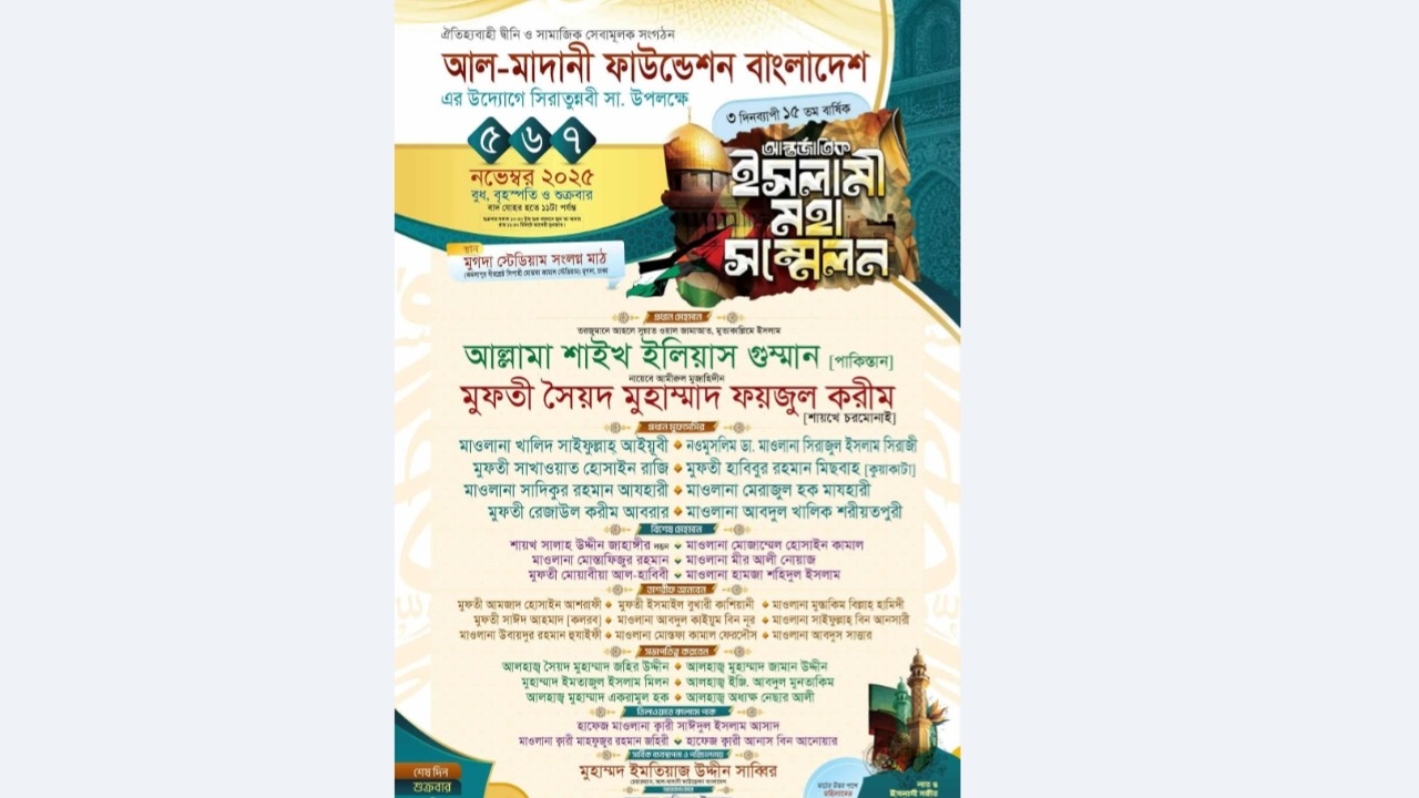 আল-মাদানী ফাউন্ডেশন বাংলাদেশের উদ্যোগে সিরাতুন্নবী সা. উপলক্ষে অনুষ্ঠিত হতে যাচ্ছে ১৫তম আন্তর্জাতিক ইসলামি মহাসম্মেলন। আগামী ৫, ৬ ও ৭ নভেম্বর (বুধ, বৃহস্পতি ও শুক্রবার) রাজধানীর ঢাকার প্রাণকেন্দ্র কমলাপুর বীরশ্রেষ্ঠ শহীদ সিপাহি মোহাম্মদ মোস্তফা কামাল স্টেডিয়াম সংলগ্ন মাঠে অনুষ্ঠিত হবে এই মহাসম্মেলন।