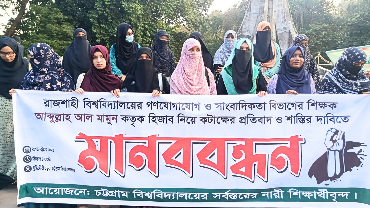 রাজশাহী বিশ্ববিদ্যালয়ের গণযোগাযোগ ও সাংবাদিকতা বিভাগের শিক্ষক আবদুল্লাহ আল মামুন কর্তৃক হিজাব নিয়ে কটাক্ষের প্রতিবাদ ও বিচার দাবিতে মানববন্ধন করেছে চট্টগ্রাম বিশ্ববিদ্যালয়ের (চবি) নারী শিক্ষার্থীবৃন্দ।