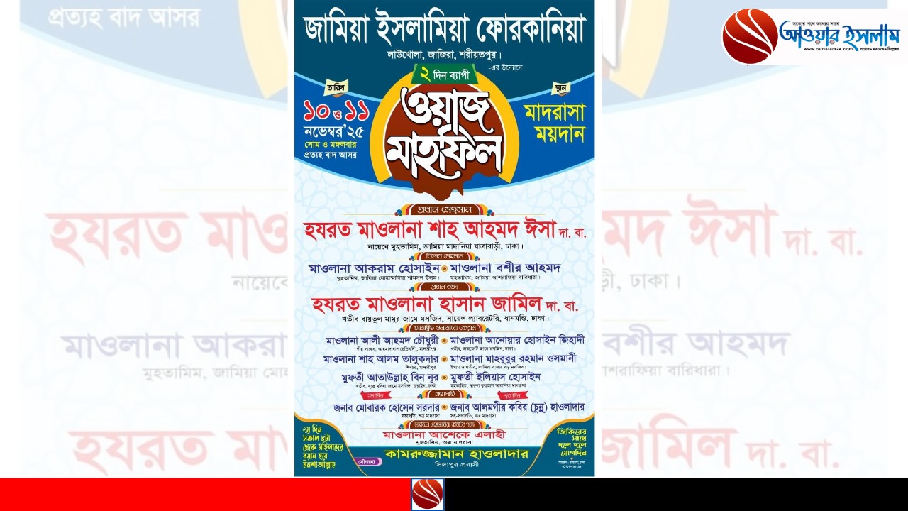 শরীয়তপুর জাজিরা থানার লাউখোলা বাজার সংলগ্ন জামি’আ ইসলামিয়া ফোরকানিয়ার উদ্যোগে আগামী ১০ ও ১১ নভেম্বর (২৫ ঈ. সোম ও মঙ্গলবার) মাদরাসা ময়দানে ২ দিনব্যাপী ১৮তম বার্ষিক ওয়াজ মাহফিল অনুষ্ঠিত হবে।