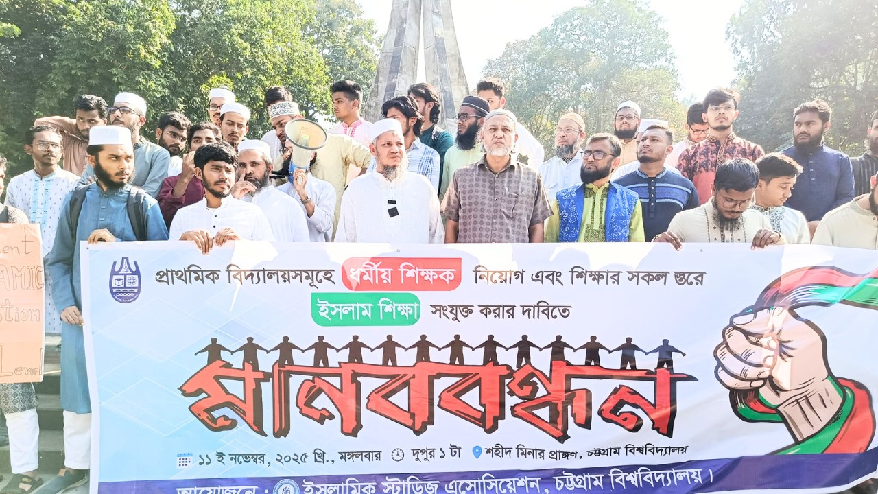 প্রাথমিক বিদ্যালয়ে ধর্মীয় শিক্ষক নিয়োগ, শিক্ষা ব্যবস্থায় ইসলামি শিক্ষা সংযুক্ত করার দাবিতে চট্টগ্রাম বিশ্ববিদ্যালয়ে মানববন্ধন হয়েছে।