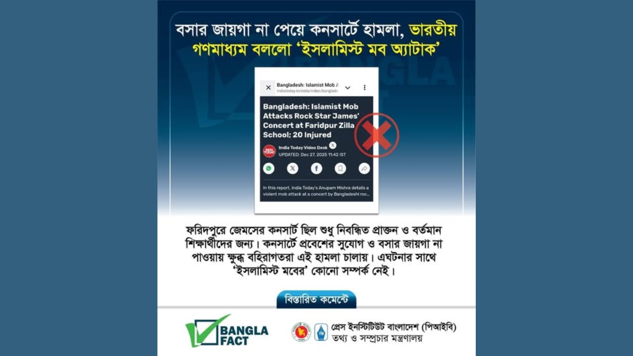 ফরিদপুরে জেমসের কনসার্টে প্রবেশের সুযোগ ও বসার জায়গা না পেয়ে ক্ষুব্ধ বহিরাগতদের কনসার্টে হামলার ঘটনাকে ভারতীয় গণমাধ্যম বললো ‘ইসলামিস্ট মব অ্যাটাক’। এটি নিয়ে ভুয়া ও অপতথ্য ছড়িয়ে বিভ্রান্তি সৃষ্টির অপচেষ্টা শনাক্ত করেছে প্রেস ইনস্টিটিউট বাংলাদেশের (পিআইবি) ফ্যাক্ট চেক ও মিডিয়া রিসার্চ টিম বাংলাফ্যাক্ট।