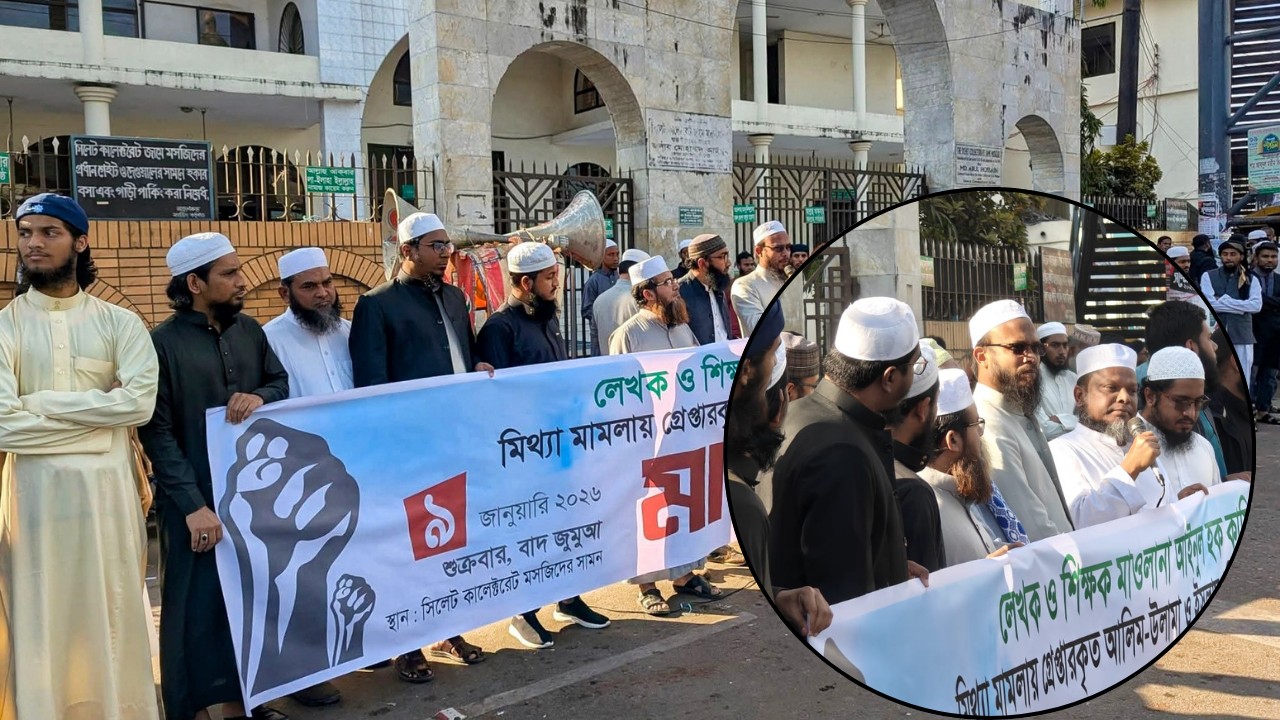 উদ্দেশ্যপ্রণোদিত ও মিথ্যা মামলায় লেখক ও শিক্ষক, জুলাই আন্দোলনের যোদ্ধা মাওলানা আইনুল হক কাসিমীসহ গ্রেপ্তারকৃত নিরীহ আলিমদের অবিলম্বে মুক্তির দাবিতে সিলেটে এক বিশাল মানববন্ধন ও প্রতিবাদ সমাবেশ অনুষ্ঠিত হয়েছে।