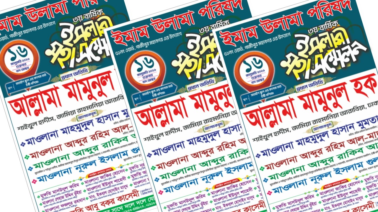 ইমাম-উলামা পরিষদের উদ্যোগে গাজীপুর মহানগরের ৫১ নম্বর ওয়ার্ড এলাকায় আজ শুক্রবার (১৬ জানুয়ারি ২০২৬) অনুষ্ঠিত হতে যাচ্ছে ৩য় বার্ষিক ঐতিহাসিক ইসলামী মহাসম্মেলন। গাজীপুরের টঙ্গী পশ্চিম থানাধীন সাতাইশ স্কুল অ্যান্ড কলেজ মাঠে এ সম্মেলনের আয়োজন করা হয়েছে।