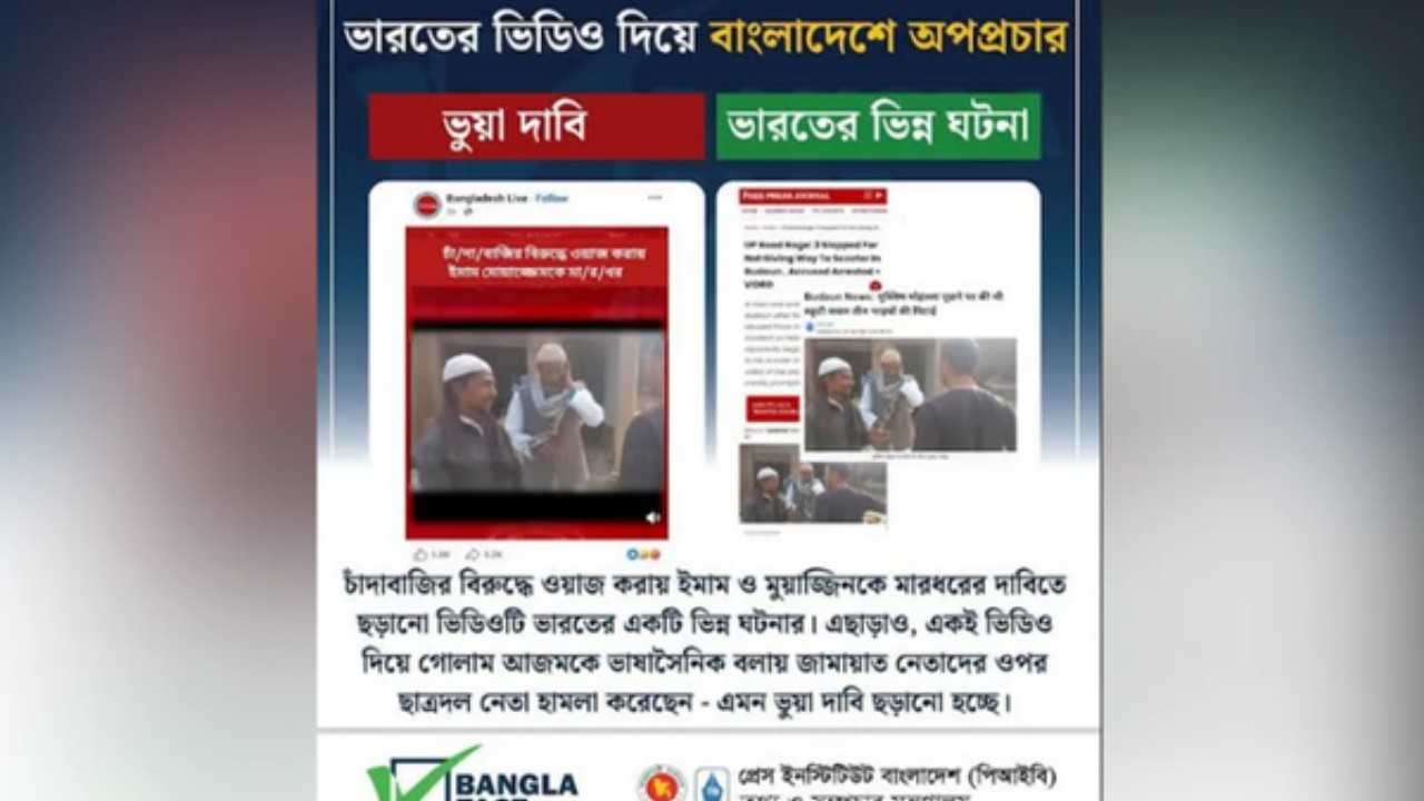 চাঁদাবাজির বিরুদ্ধে ওয়াজ করায় ইমাম ও মুয়াজ্জিনকে মারধরের দাবিতে ছড়ানো ভিডিওটি ভারতের বলে শনাক্ত করেছে প্রেস ইনস্টিটিউট বাংলাদেশের (পিআইবি) ফ্যাক্ট চেক ও মিডিয়া রিসার্চ টিম বাংলাফ্যাক্ট।