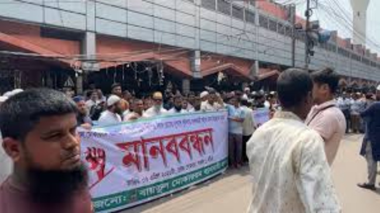 রাজধানীর বায়তুল মোকাররম মার্কেটের পশ্চিম পাশে ফুটপাত দখলমুক্ত করার দাবিতে মানববন্ধন করেছেন মার্কেটের ব্যবসায়ীরা।