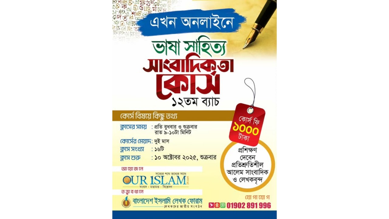 প্রসঙ্গত, আওয়ার ইসলাম ও ইসলামি লেখক ফোরামের যৌথ আয়োজনে দীর্ঘদিন ধরেই ভাষা সাহিত্য ও সাংবাদিকতা কোর্সের আয়োজন করা হচ্ছে। রাজধানীর চৌধুরীপাড়া শেখ জনুরুদ্দীন মাদরাসায় সরাসরি অংশগ্রহণে প্রতি দুই মাস পরপর এই কোর্সের আয়োজন করা হয়। এবারই প্রথমবারের অনলাইনেও কোর্সটি শুরু হচ্ছে। এতে দেশের নানা প্রান্ত এমনকি বিদেশ থেকেও কোর্সটিতে অংশ নেওয়ার সুযোগ সৃষ্টি হয়েছে।