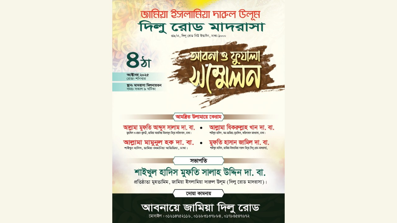 রাজধানীর রমনা থানাধীন ঐতিহ্যবাহী ইসলামী বিদ্যাপীঠ জামিয়া ইসলামিয়া দারুল উলুম দিলুরোড-এর উদ্যোগে আজ শনিবার (৪ অক্টোবর ২০২৫) দিনব্যাপী “আবনা ও ফুযালা সম্মেলন” অনুষ্ঠিত হবে। সকাল ৮টা থেকে বাদ জোহর পর্যন্ত দুই অধিবেশনে এ সম্মেলনের কার্যক্রম চলবে।