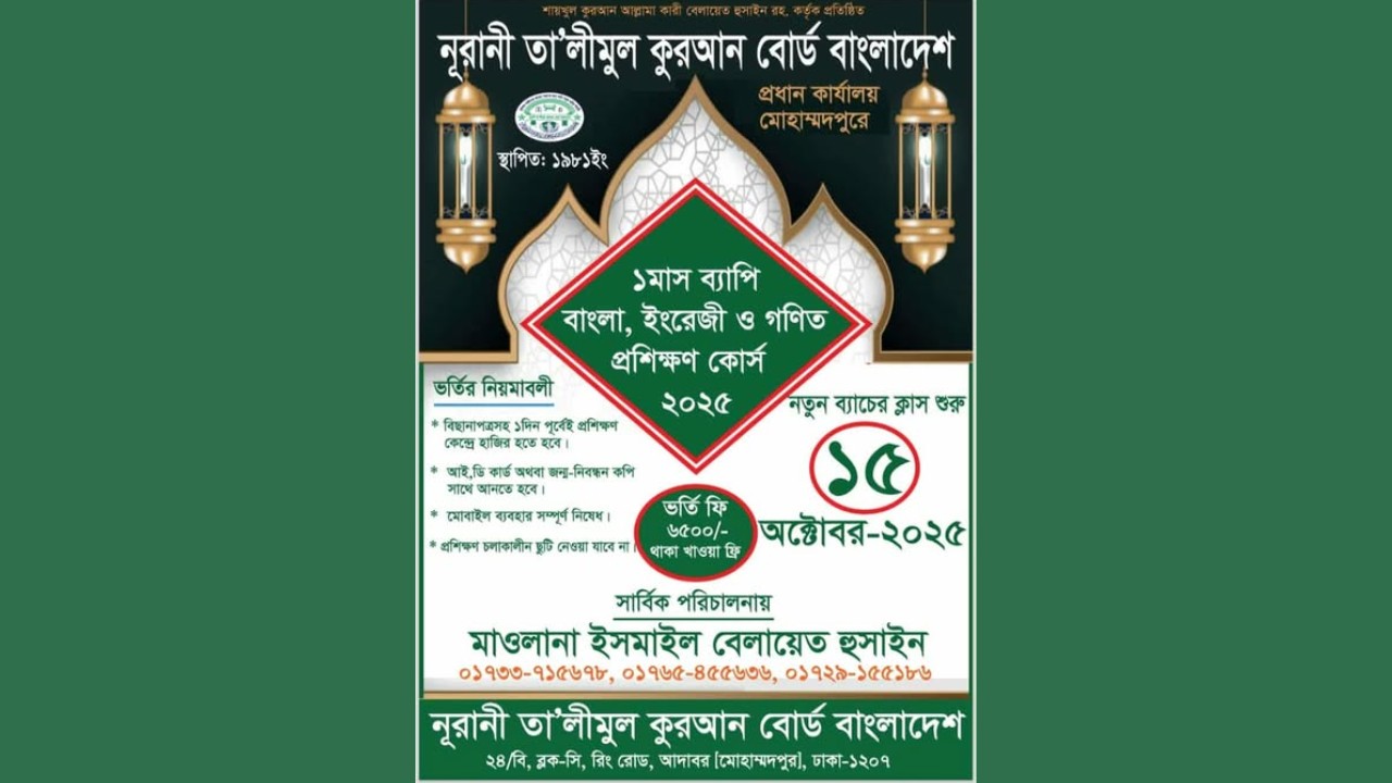 শাইখুল কুরআন আল্লামা কারী বেলায়েত হুসাইন রহ. প্রতিষ্ঠিত নূরানী তালীমুল কুরআন বোর্ড বাংলাদেশের প্রধান কার্যালয় ঢাকার মোহাম্মদপুরে মাসব্যাপী বাংলা, গণিত ও ইংরেজি প্রশিক্ষণে ভর্তি চলছে।