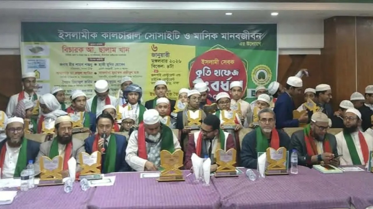 ইসলামি কালচারাল সোসাইটি ও মাসিক মানবজীবনের উদ্যোগে রাজধানীতে অনুষ্ঠিত হয়েছে ‘ইসলামি সেবক সম্মাননা ও বিশ্বজয়ী হাফেজ-কৃতি হাফেজ সংবর্ধনা ২০২৫’। গত মঙ্গলবার (৬ জানুয়ারি) বিকেলে মগবাজার মোড়ের একটি রেস্টুরেন্ট অ্যান্ড চাইনিজ রেস্টুরেন্টে এই সংবর্ধনা প্রদান অনুষ্ঠান অনুষ্ঠিত হয়। অনুষ্ঠানে ১৫জন গুণী ব্যাক্তিকে ইসলামি সেবক সম্মাননা, একজন বিশ্বজয়ী হাফেজ ও বেফাক বোর্ড পরীক্ষা এবং হুফ্ফাজুল কোরআন ফাউন্ডেশন বার্ষিক পরীক্ষায় মুমতাজ বিভাগে উত্তীর্ণসহ যারা মেধাস্থান অর্জন করেছে এমন ৩৯ জন কৃতি হাফেজদের ক্রেস্ট, সার্টিফিকেট ও উত্তরীয় প্রদানের মাধ্যমে এই সংবর্ধনা দেয়া হয়।