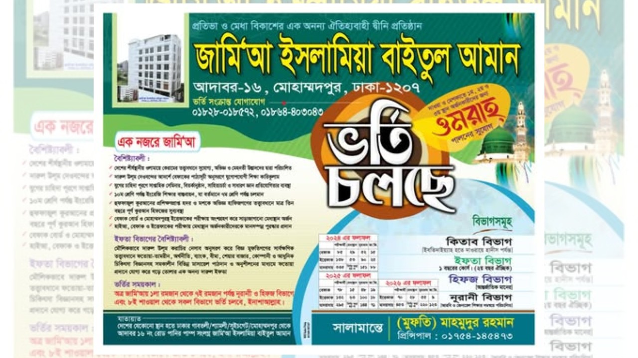 যাতায়াত: দেশের যেকোনো স্থান থেকে ঢাকার গাবতলী/শ্যামলী/সুইচগেট /মোহাম্মদপুর থেকে আদাবর ১৬নং রোড পানির পাম্প সংলগ্ন জামি'আ ইসলামিয়া বাইতুল আমান। ভর্তিসংক্রান্ত যোগাযোগ: ০১৮২৮-০১৮৫৭২, ০১৮৬৪-৪০৩০৪৩।