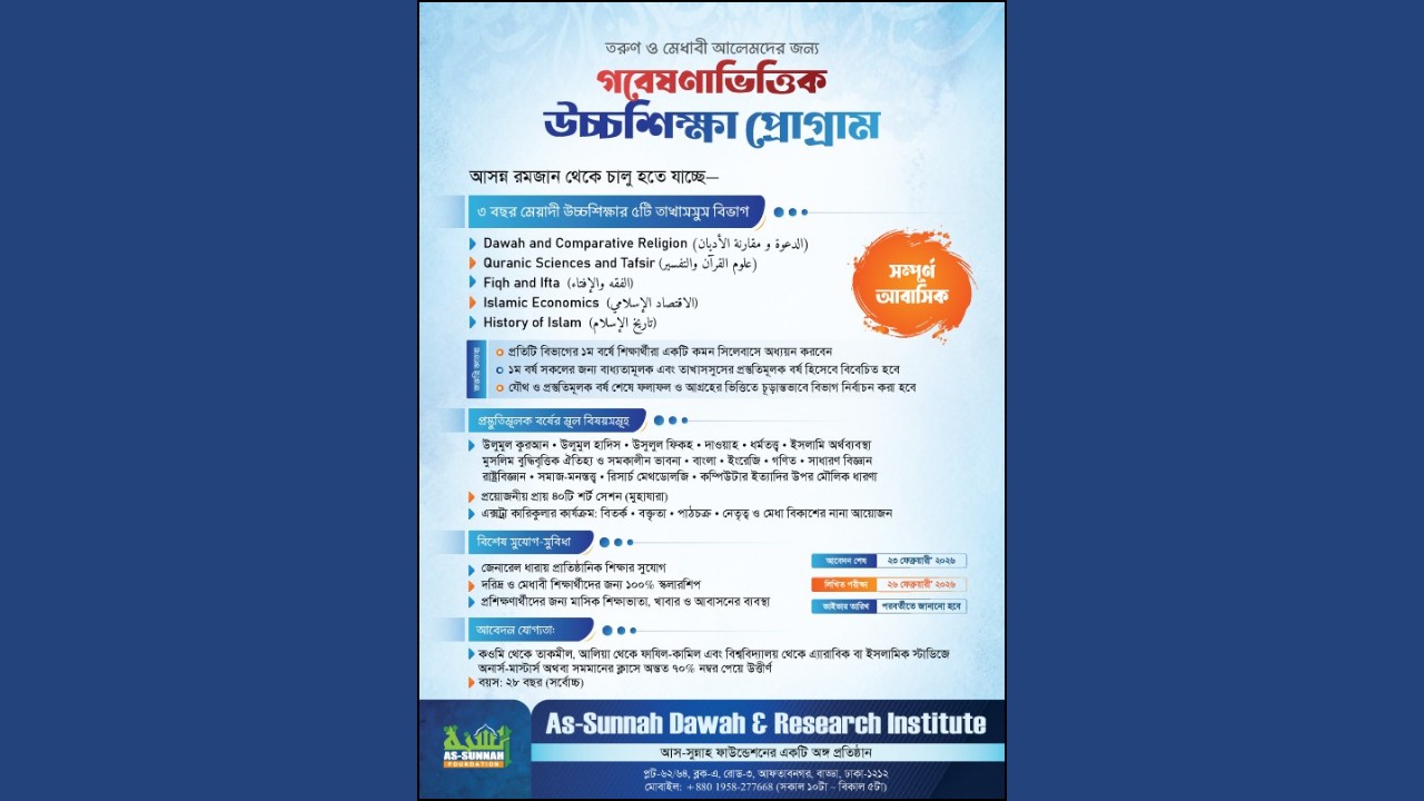 সময়ের ভাষা বোঝেন, আধুনিক মতবাদ ও ইসলামের গভীর জ্ঞান রাখেন—এমন বিজ্ঞ আলেম-দাঈ গড়ে তোলার লক্ষ্যেই আস-সুন্নাহ ফাউন্ডেশনের বিশেষ সহযোগী প্রতিষ্ঠান আস-সুন্নাহ দাওয়াহ অ্যান্ড রিসার্চ ইনস্টিটিউট চালু করতে যাচ্ছে ৩ বছর মেয়াদী গবেষণাভিত্তিক উচ্চশিক্ষা প্রোগ্রাম।