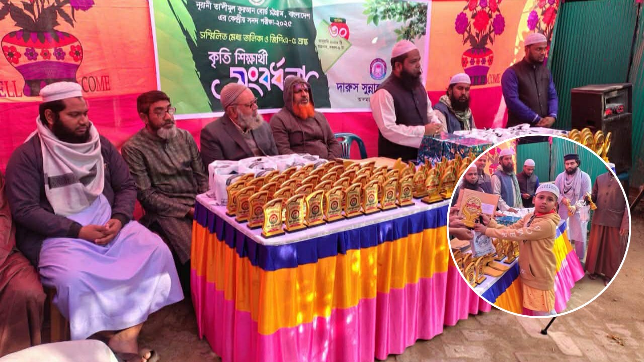 শুক্রবার (৩০ জানুয়ারি) কৃতি ছাত্রছাত্রীদের সংবর্ধনা, পুরস্কার ও সার্টিফিকেট প্রদান এবং দোয়া মাহফিলের আয়োজন করা হয়। কৃতি ছাত্রছাত্রীদের হাতে নূরানী তা'লীমুল কুরআন বোর্ড চট্টগ্রাম বাংলাদেশ ও দারুস সুন্নাহ একাডেমির সৌজন্যে পুরস্কার তুলে দেওয়া হয়।