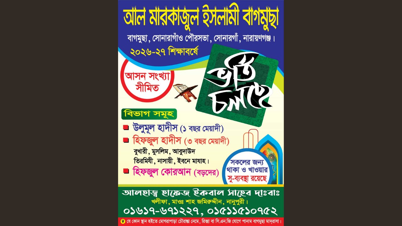হিফজুল হাদিস, উলুমুল হাদিস ও বড়দের হিফজুল কোরআন বিভাগে ভর্তি নিচ্ছে নারায়ণগঞ্জের সোনারাগাঁও পৌরসভা এলাকার ব্যতিক্রমধর্মী দ্বীনি প্রতিষ্ঠান আল মারকাজুল ইসলামী বাগমুছা। প্রতিষ্ঠানটির পরিচালক নানুপুরী পীরের খলীফা, ও বুযুর্গ আলেম আলহাজ্ব হাফেজ ইকবাল।