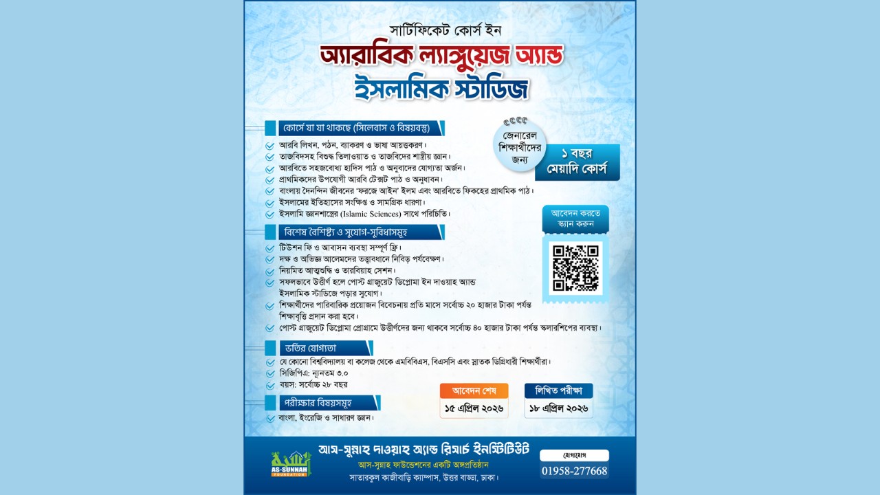 এ লক্ষ্যেই আস-সুন্নাহ দাওয়াহ অ্যান্ড রিসার্চ ইনস্টিটিউট পরিচালনা করছে ‘সার্টিফিকেট কোর্স ইন অ্যারাবিক ল্যাঙ্গুয়েজ অ্যান্ড ইসলামিক স্টাডিস’। কোর্সটির প্রথম ব্যাচ ইতোমধ্যে সফলভাবে সম্পন্ন হয়েছে।