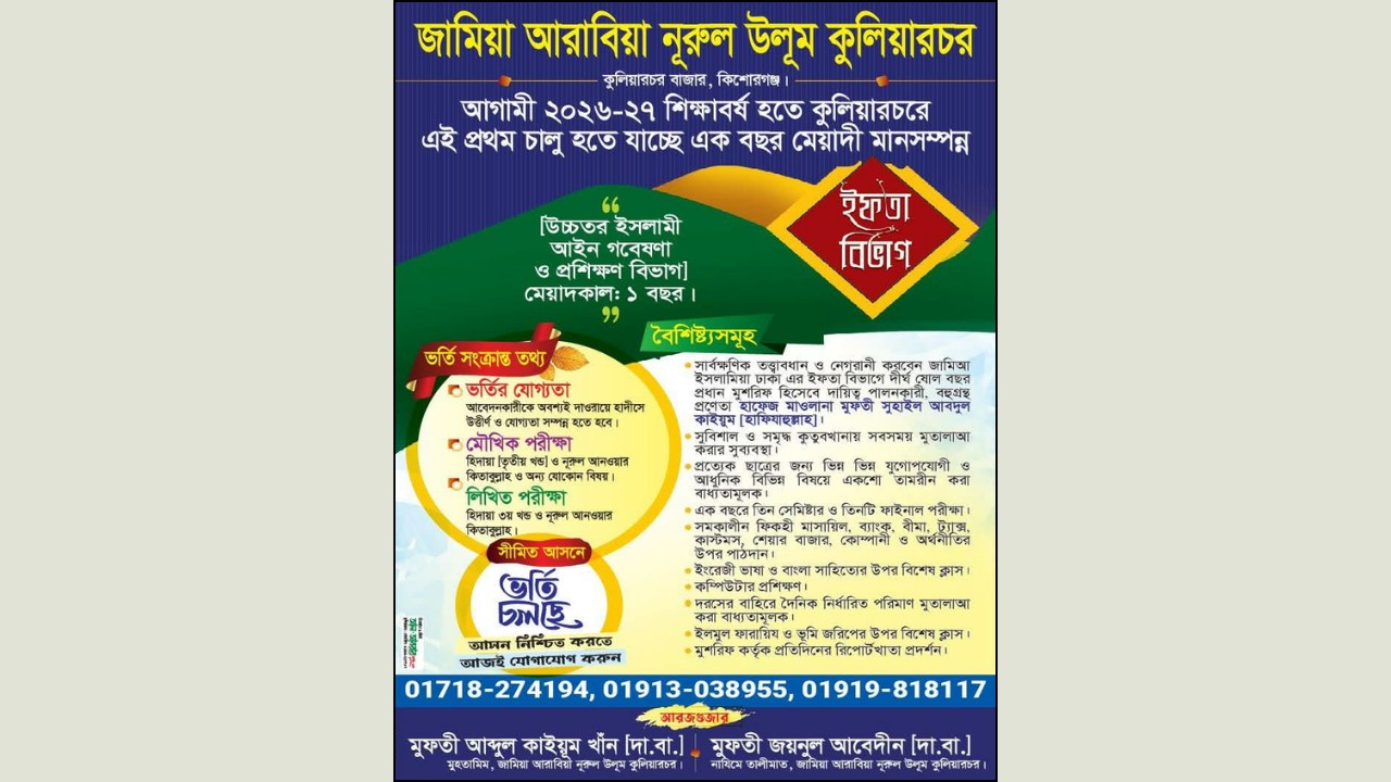 ৮ শাওয়াল, শনিবার (২৮ মার্চ) থেকে ইফতা বিভাগে ভর্তি শুরু হয়েছে।