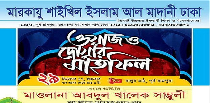 আওয়ার ইসলাম : আগামী ২৯ ডিসেম্বর (শুক্রবার) রাজধানীর রামপুরার মারকাযু শাইখিল ইসলাম আল মাদানী-এর উদ্যোগে ওয়াজ ও দোয়ার মাহফিলের আয়োজন করা হয়েছে।