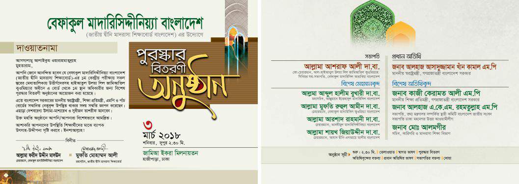 আওয়ার ইসলাম: বেফাকুল মাদারিসিদ্বীনিয়া বাংলাদেশ (জাতীয় দ্বীনি মাদরাসা শিক্ষা বোর্ড) আগামী ৩রা মার্চ রোজ শনিবার সকাল ৯টা থেকে বিকাল ৫টা পর্যন্ত বোর্ড অফিস সংলগ্ন, রাজধানীর ঐতিহ্যবাহী দ্বীনিশিক্ষা প্রতিষ্ঠান জামিআ ইক্বরা বাংলাদেশ মিলনায়তনে