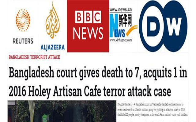 যুক্তরাজ্যভিত্তিক প্রভাবশালী গণমাধ্যম বিবিসি লিখেছে ‘২০১৬ সালে ক্যাফে হামলার জন্য ইসলামপন্থী জঙ্গিদের মৃত্যুদণ্ডে দন্ডিত করেছে বাংলাদেশ।'