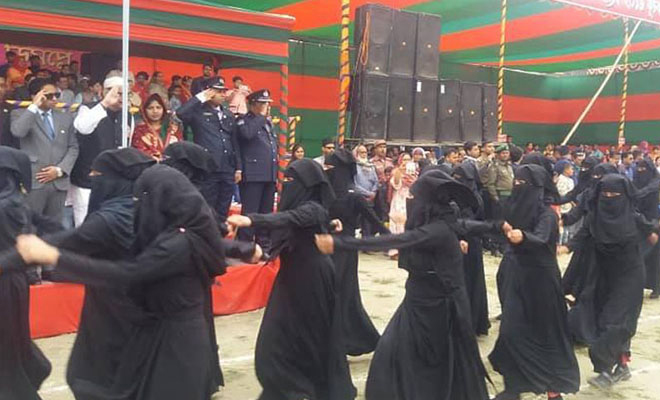 মির্জাপুরে এই প্রথম আফাজ উদ্দিন দারুল উলুম দাখিল মাদরাসার নারী শিক্ষার্থীরা বোরকা পরে কুচকাওয়াজে অংশগ্রহণ করে।