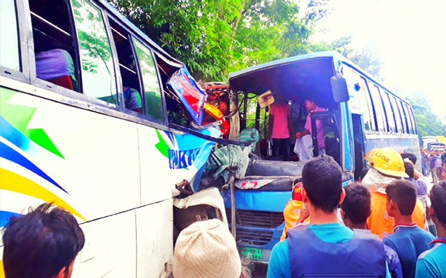 সূত্র মতে জানা যায়, শুক্রবার বিকালের দিকে ইউনিক পরিবহনের একটি বাস আমজাদের বাজার এলাকায় পৌঁছালে অপর একটি বাসের সঙ্গে সংঘর্ষ ঘটে। এতে ঘটনাস্থলেই আমেনা বেগম নামে এক নারীর মৃত্যু হয়। পাশাপাশি বাসে থাকা যাত্রীদের মধ্যে আরও অন্তত ১০ জন আহত হয়। পরবর্তীকালে স্থানীয়রা আহতদের উদ্ধার করে নিকটবর্তী হাসপাতালে প্রেরণ করে।