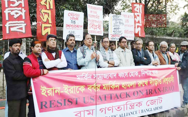 গণতান্ত্রিক বাম জোটের সংবাদ বিজ্ঞপ্তিতে বলা হয়, সমাবেশে নেতারা বলেছেন, মধ্যপ্রাচ্যসহ গোটা দুনিয়াব্যাপী যুদ্ধবাজ মার্কিন সাম্রাজ্যবাদ স্বাধীনতা-সার্বভৌমত্ব লঙ্ঘন করে মিথ্যা অভিযোগ এনে একের পর এক হামলা ও হত্যাকাণ্ড সংঘটিত করছে।