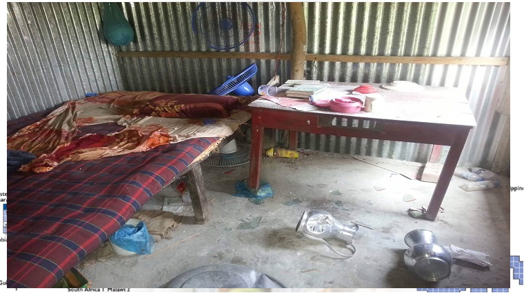 সরেজমিনে গিয়ে দেখা যায়, মসজিদের বেড়ায় অসংখ্য দায়ের কোপ। ভেতরে দেয়াল ঘড়ি, পানির দুটি জগ ও খাবারের জিনিসপত্র লন্ডভন্ড হয়ে রয়েছে।