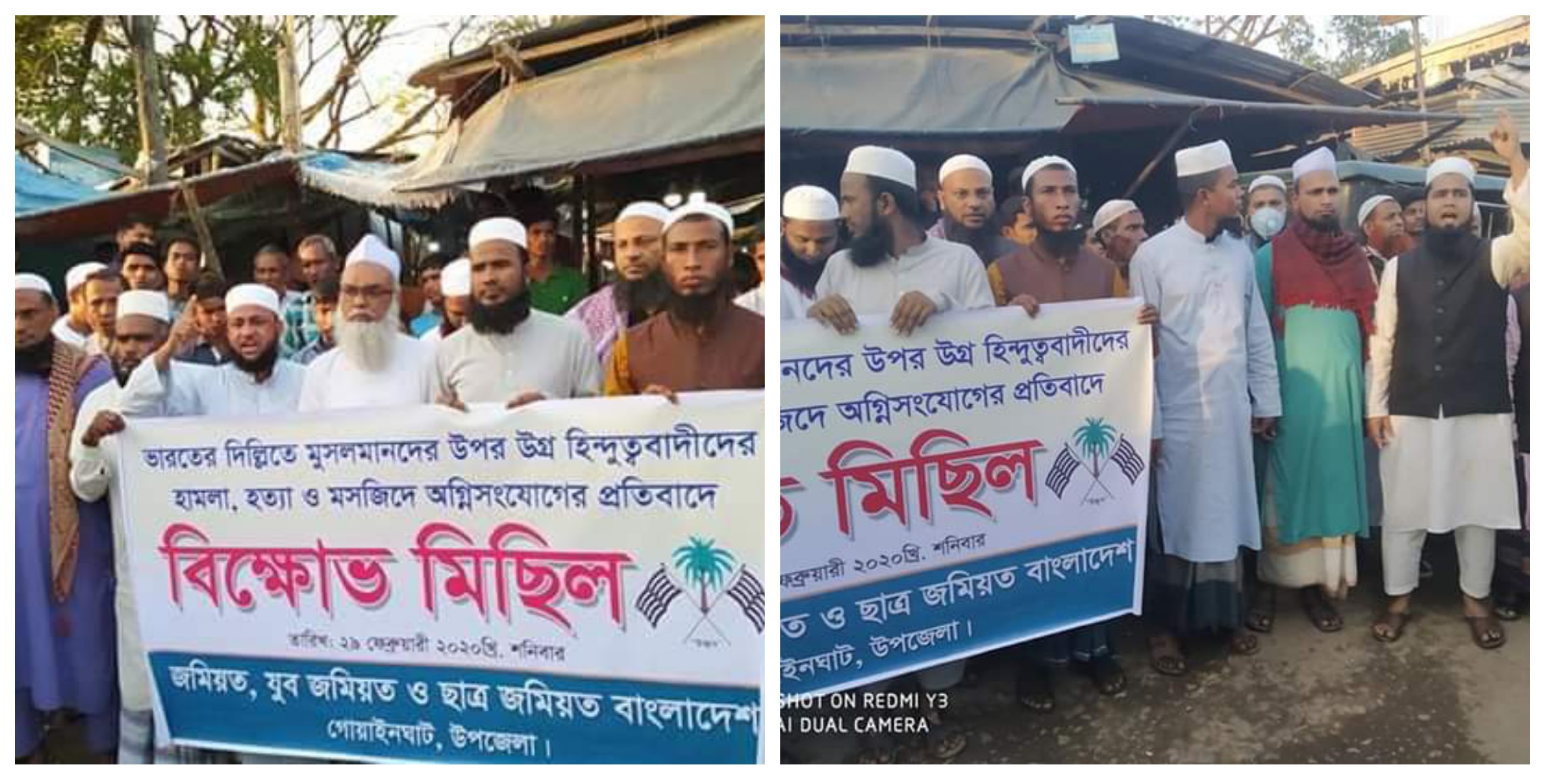আওয়ার ইসলাম: গোয়াইনঘাট উপজেলা সদরে, গোয়াইনঘাট উপজেলা জমিয়ত যুব ও ছাত্র জমিয়তের যৌথ উদ্যোগে ভারতের দিল্লিতে মুসলিম নির্যাতন ও মসজিদ, মাদরাসা ও ঘরবাড়িতে অগ্নিসংযোগ বন্ধের দাবিতে বিক্ষোভ মিছিল অনুষ্ঠিত হয়।