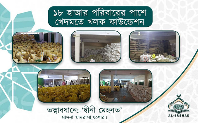 সাম্প্রতিক করোনা ভাইরাসের কারণে উদ্ভূত পরিস্থিতে অসহায় মানুষের পাশে দাঁড়ানোর উদ্যোগ নিয়ে ইতোমধ্যেই মাঠে নেমেছে ‘খেদমতে খলক ফাউণ্ডেশন’। বিতরণ টিমের সমন্বয়ক মুফতি আজিমুদ্দীন বলেন, চলমান পরিস্থিতিকে সামনে রেখে ‘দ্বীনী মেহনত’ এর তত্ত্বাবধানে ‘খেদমতে খলক ফাউণ্ডেশন’ এর উদ্যোগে বৃহত্তর খুলনা বিভাগের ১০টি জেলার ৬৩টি উপজেলায় ৮০টি কেন্দ্র স্থাপন করা হয়েছে। এবারে সহযোগিতা পাচ্ছে মোট ১৮ হাজার পরিবার।