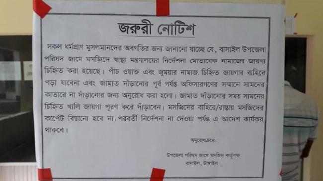 আওয়ার ইসলাম: টাঙ্গাইল জেলার বাসাইল উপজেলা পরিষদ জামে মসজিদে সামনের কাতারে না দাঁড়ানোর জন্য রীতিমতো নোটিশ টাঙিয়ে দেওয়া হয়েছে! এ নিয়ে ক্ষোভ প্রকাশ করেছেন স্থানীয় সাধারণ মানুষ।