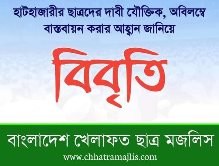 আজ বৃহস্পতিবার সন্ধায় সংগঠনটির কেন্দ্রীয় সভাপতি মুহাম্মদ জাকির হুসাইন এক বিবৃতিতে বলেন, হাটহাজারী মাদরাসা বাংলাদেশের প্রাচীন ও ঐতিহ্যবাহী একটি আদর্শ দ্বীনি বিদ্যাপীঠ। বিগত বেশকিছু দিন যাবত মাদরাসাটি পরিচালনার ক্ষেত্রে আভ্যন্তরীণ প্রশাসনিক ও আর্থিক বিভিন্ন অনিয়ম পরিলক্ষিত হচ্ছিল। এতে ছাত্রদের মাঝে দীর্ঘদিন ধরে পুঞ্জিভূত ক্ষোভের বহিঃপ্রকাশ বর্তমান এ আন্দোলন। বাংলাদেশ খেলাফত ছাত্র মজলিস ছাত্রদের শান্তিপূর্ণ এ আন্দোলনের সাথে একাত্মতা পোষণ করছে।