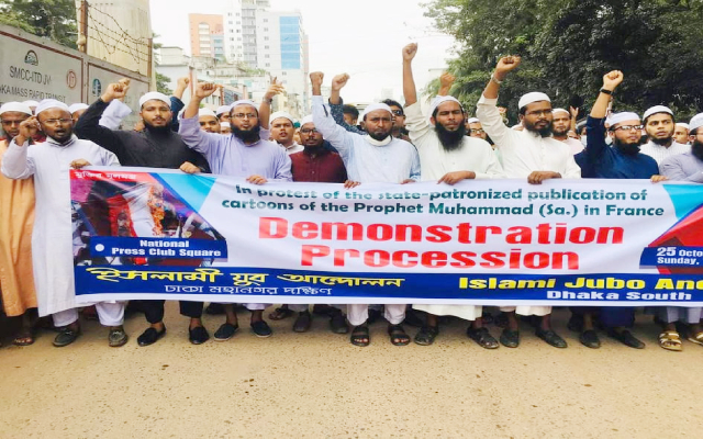 আজ ২৫ অক্টোবর (রবিবার) সকাল সাড়ে ১০ টায় জাতীয় প্রেসক্লাব চত্বরে ইসলামী যুব আন্দোলন ঢাকা মহানগর দক্ষিণ কর্তৃক আয়োজিত ফ্রান্সে রাষ্ট্রীয় পৃষ্ঠপোষকতায় বিশ্বনবী সাল্লাল্লাহু আলাইহি ওয়াসাল্লাম এর ব্যঙ্গচিত্র প্রদর্শনের প্রতিবাদে বিক্ষোভ মিছিল পূর্ব সমাবেশে সভাপতির বক্তব্যে তিনি আরও বলেন, ফ্রান্সে রাসুল সা. কে নিয়ে ব্যাঙ্গাত্মক চিত্র প্রদর্শন করা নতুন নয়, উসমানী খেলাফত এর সুলতান দ্বিতীয় আব্দুল হামিদের শাসনামলেও এমন ঘৃণ্যকর্ম করেছিলো এবং শাস্তিও পেয়েছিলো। এহেন অসভ্য কর্মকাণ্ড বন্ধ না করলে বিশ্বব্যাপী ম্যাক্রো সরকারকে বয়কট করা হবে।