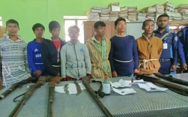 আটকরা হলেন- বান্দরবানের রোয়াংছড়ি উপজেলার বাওয়াপাড়া এলাকার চাইলগ্য ত্রিপুরা (৬০), বলিরাম ত্রিপুরা (৪৮), বিরমনি ত্রিপুরা (৪৫) বিষ্ণমনি ত্রিপুরা (৪৪) ও জীবন ত্রিপুরা (২৬)। রাঙামাটির রাজস্থলী উপজেলার লক্ষণ ত্রিপুরা (৩০) ও বীর বাহাদুর ত্রিপুরা (২৬)।