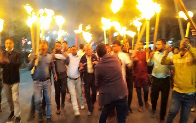 আওয়ার ইসলাম: শহীদ রাষ্ট্রপতি জিয়াউর রহমানের বীর উত্তম খেতাব প্রত্যাহারের সিদ্ধান্তের প্রতিবাদে বিএনপির যুগ্ম মহাসচিব অ্যাডভোকেট রুহুল কবির রিজভীর নেতৃত্বে রাজধানীর নয়াপল্টন এলাকায় আবারও মশাল মিছিল অনুষ্ঠিত হয়েছে।