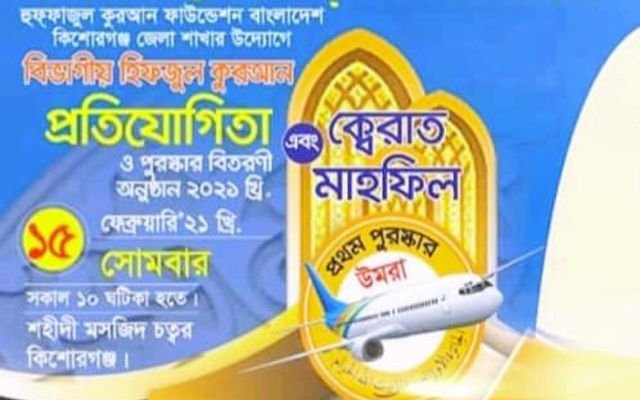 কোরআনের আলো বিশ্বব্যাপী ছড়িয়ে দিতে প্রতি বছরের ন্যায় এবারও আড়ম্বরপূর্ণ আয়োজনে কিশোরগঞ্জে হুফফাফুল কোরআন ফাউন্ডেশন বাংলাদেশ কিশোরগঞ্জ জেলা শাখার উদ্যোগে আল্লামা আযহার আলী আনোয়ার শাহ রহ. ফাউন্ডেশনের আয়োজনে বিভাগীয় হিফজুল কোরআন প্রতিযোগিতা, পুরষ্কার বিতরণী অনুষ্ঠান এবং কেরাত মাহফিল অনুষ্ঠিত হতে যাচ্ছে।
