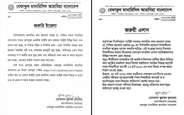 এর প্রেক্ষিতে আজ রোববার বেফাকুল মাদারিসিল আরাবিয়া বাংলাদেশ-এর ভারপ্রাপ্ত মহাপরিচালক মাওলানা মুহাম্মদ যুবায়ের স্বাক্ষরিত এক জরুরি বিজ্ঞপ্তিতে জানানো হয়, ভাইরাল হওয়া সেই বিজ্ঞপ্তিটি ভূয়া এবং প্রযুক্তির অপব্যবহার করে এ কাজ করা হয়েছে। পাশাপাশি বেফাক সে বিজ্ঞপ্তির ব্যাপারে আইনি সহায়তা নেওয়ারও আভাস দেয়।