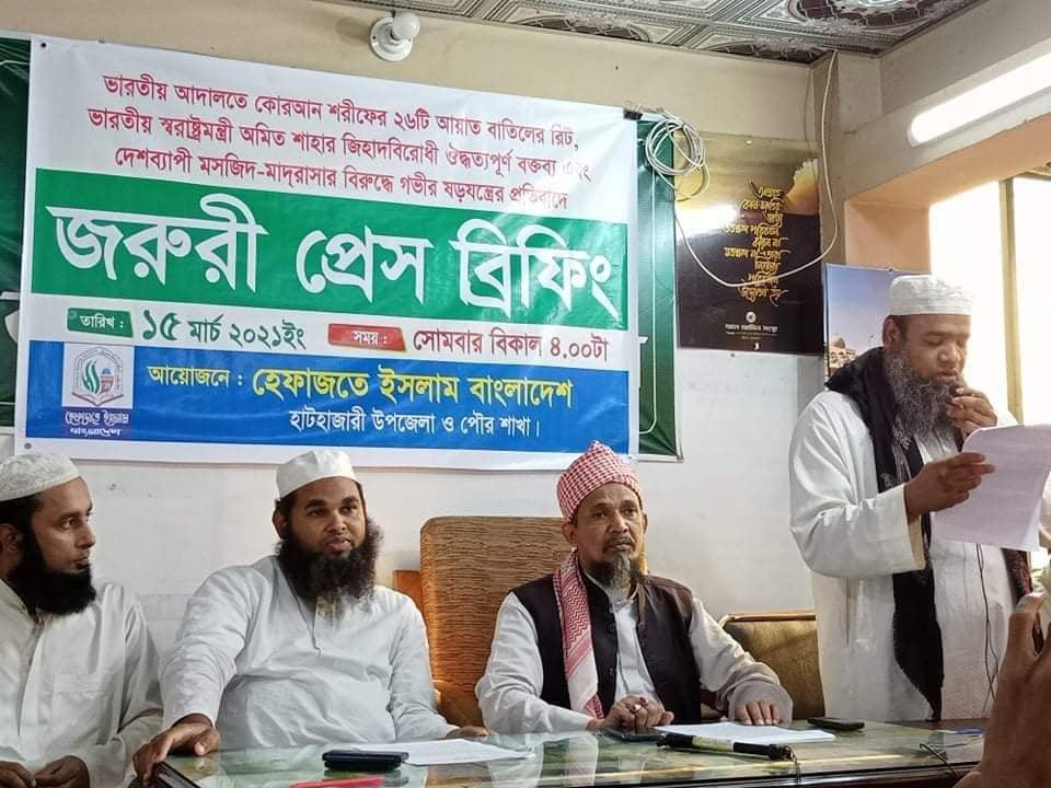 ভারতীয় আদালতে কোরআন শরীফের ২৬টি আয়াত বাতিলের রিট, ভারতীয় স্বরাষ্ট্রমন্ত্রী অমিত শাহার জিহাদবিরোধী ঔদ্ধত্যপূর্ণ বক্তব্য এবং দেশব্যাপী মসজিদ-মাদ্রাসার বিরুদ্ধে গভীর ষড়যন্ত্রের প্রতিবাদে হেফাজতে ইসলাম বাংলাদেশ হাটহাজারী উপজেলা ও পৌরসভা শাখার জরুরি প্রেস ব্রিফিং হাটহাজারী আল আমিন সংস্থার কার্যালয়ে অনুষ্ঠিত হয়।