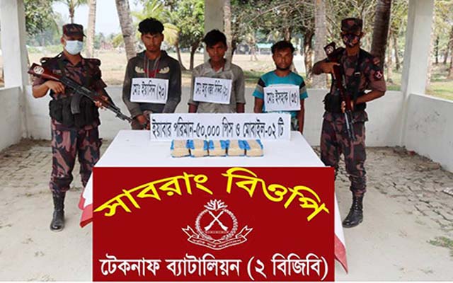 এমন সময় বিজিবি টহল চ্যালেঞ্জ করলে তারা পালিয়ে যাওয়ার চেষ্টা করে। একপর্যায়ে তাদের আটক করতে সক্ষম হয় বিজিবি। তাদের দেহ তল্লাশি করে তিনটি বড় প্যাকেটে ৫০ হাজার পিস ইয়াবা পাওয়া যায়, যার বাজার মূল্য এক কোটি ৫০ লাখ টাকা। উদ্ধার ইয়াবাসহ সংশ্লিষ্ট আইনে মামলা দায়ের করে ওই তিনজনকে টেকনাফ মডেল থানায় হস্তান্তর করা হয়েছে বলে জানান তিনি।
